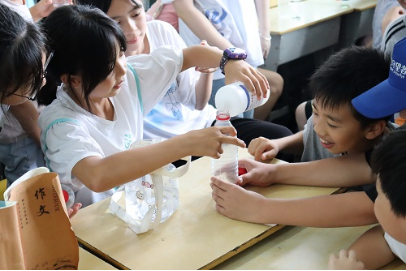 当日由团队成员马红梅和李欣给孩子们上了两堂生动有趣的化学实验课。“哇,怎么做到的?太神奇了吧!”在马红梅的“化学红绿灯”实验中,瓶子内的黄色液体经摇晃后接连变成红色和绿色,教室里的孩子们纷纷探头观察并热烈讨论起来。接着马红梅向孩子们介绍实验所需的简单材料,并解释这一神奇现象发生的化学原因——反应体系交替发生还原与氧化反应的结果。随后团队其他成员给每个小组分发实验材料,指导孩子们亲自动手操作。孩子们认真仔细地完成一个个实验步骤,切身体会着化学中蕴含的奥秘。