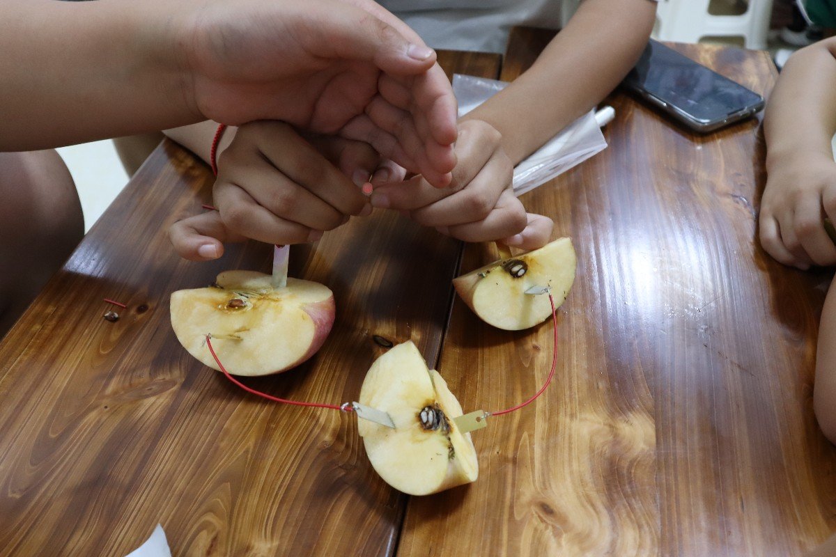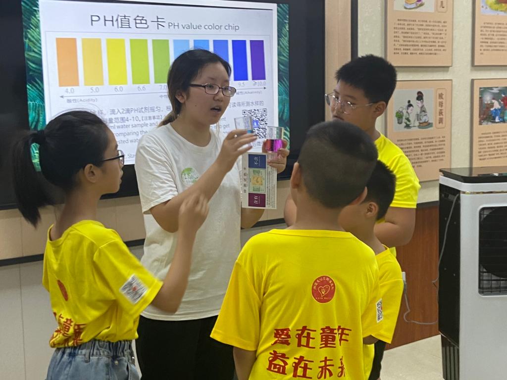 第一课,由湿地使者张绪霖以及四位助教帮助小朋友们完成水果电池的实验,带领小朋友们领略自然科学的奇妙。第二课,湿地使者苏蕾用一些简单的试剂教小朋友们测水样的pH和钙镁含量,让小朋友们亲身见证颜色的变化,提高小朋友对湿地的兴趣,随后为小朋友们讲解湿地有关的知识,并不时向小朋友们提问,增加课堂互动,进一步讲解湿地保护对我们的重要性。