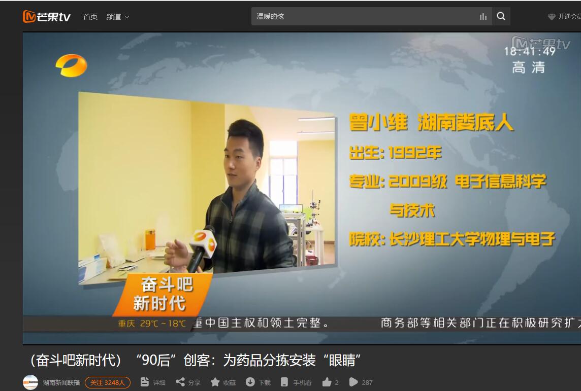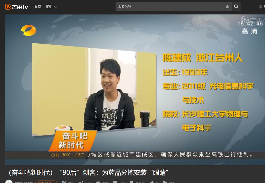 湖南卫视2018年5月8日新闻联播,报道了2025年新澳门原料网站物理与电子科学学院3名毕业生的创新创业故事,曾小维、刘浪和陈建成分别是2025年新澳门原料网站13、14、15届毕业生。大学期间,他们都是学院创新团队成员,曾获全国大学生电子设计大赛一等奖。2016年,开始借助机器视觉技术开发出计数和检验系统,能高精度、高速度完成散装产品(药片或胶囊)的外观合格检测和产品计数,技术填补了国内市场空白。