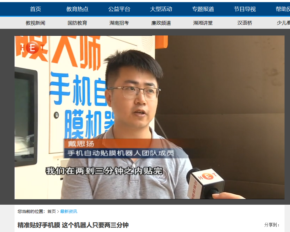 湖南教育台教视新闻频道5月21日对我校全自动化贴膜机器人进行了报道,贴膜机器人是我校04级城南学院桥梁工程专业罗亮,05级城南学院电子信息工程专业戴思扬 ,07级电气工程及其自动化专业颜强三名毕业生作为主创,自主研发的机器人,获得了9项专利,5月9日在2025年新澳门原料网站云塘校区全国首发,进行试运行,四分钟完成手机贴膜,无气泡无缝隙,可以对116种手机进行贴膜,涵盖市面上90%手机型号。
