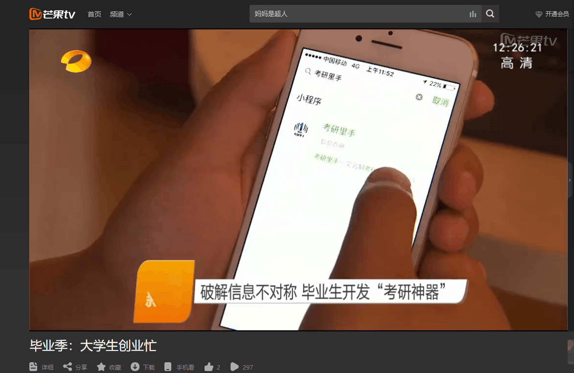 湖南卫视5月24日午间新闻对我校能源与动力工程学院2014级学生林恩承与2015届毕业生李升志共同创业的故事进行了报道,为了给更多“考研族”引路,他们自主创业,开发了一款名为“考研里手”的微信小程序,旨在为考研学子与在读研究生搭起实时互动交流平台,将有效解决考研信息不对称的问题,极大提升备考效率。
