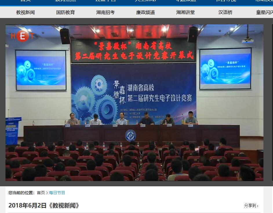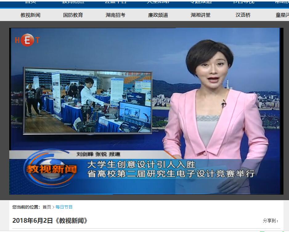 湖南教育电视台6月2日教视新闻11分30秒处,对我校举办的湖南省高校第二届研究生电子设计竞赛进行了报道,湖南省高校研究生电子设计竞赛是由我校发起,湖南省人民政府学位委员会办公室主办,面向全省高等院校研究生的团体性电子设计竞赛,首届与今年第二届比赛均由我校承办,本次比赛来自中南大学、国防科技大学等14所高校的83支队伍参赛,我校在此次竞赛中仍展现了较强的竞赛优势,获1个一等奖,2个二等奖,4个三等奖。由我校物理与电子科学学院选送的作品“微重力助力吊臂”受到专家一致好评,获得了包括“景嘉微杯”团队一等奖、企业奖、优秀个人奖、优秀指导教师奖等比赛奖项。
