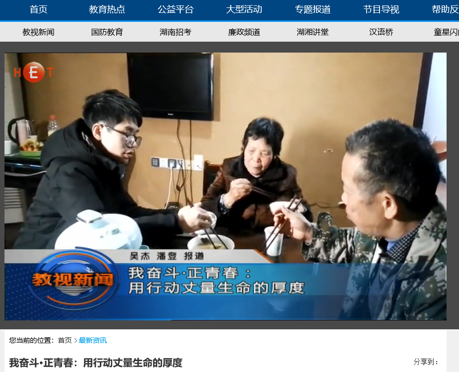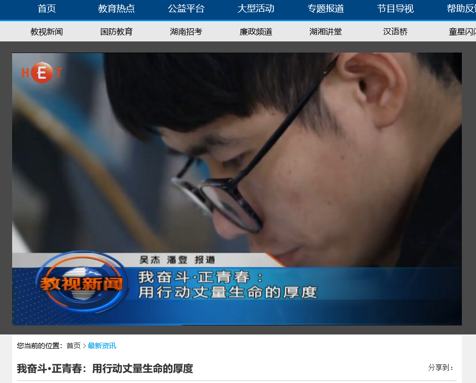 6月11日湖南教育电视台首页最新资讯,以《我奋斗·正青春:用行动丈量生命的厚度》为题对我校计算机与通信工程学院15级研究生邹勇松进行了报道。