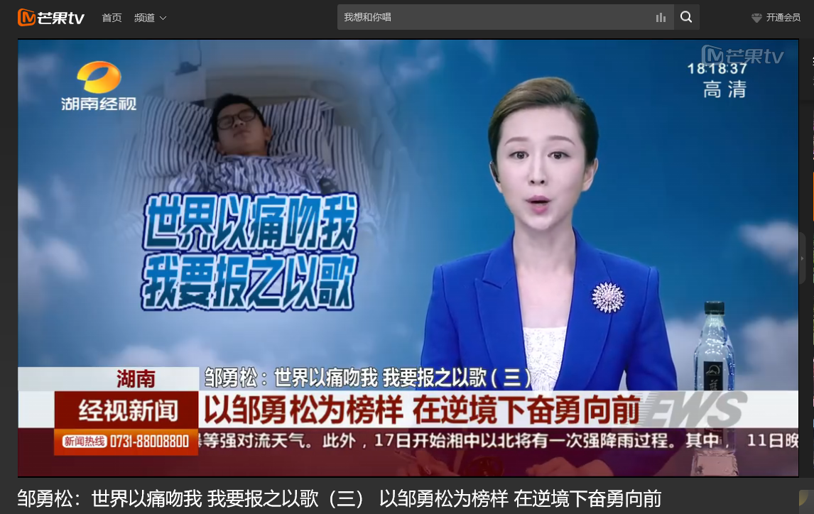 湖南经视 6月11日经视新闻,以《邹勇松:世界以痛吻我 我要报之以歌(三) 以邹勇松为榜样 在逆境下奋勇向前》为题对我校计算机与通信工程学院15级研究生邹勇松进行了报道。