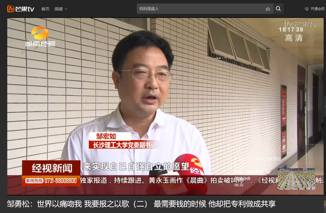 湖南经视 6月10日经视新闻,以《世界以痛吻我 我要报之以歌(二)最需要钱的时候 他却把专利做成共享》为题对我校计算机与通信工程学院15级研究生邹勇松进行了报道。