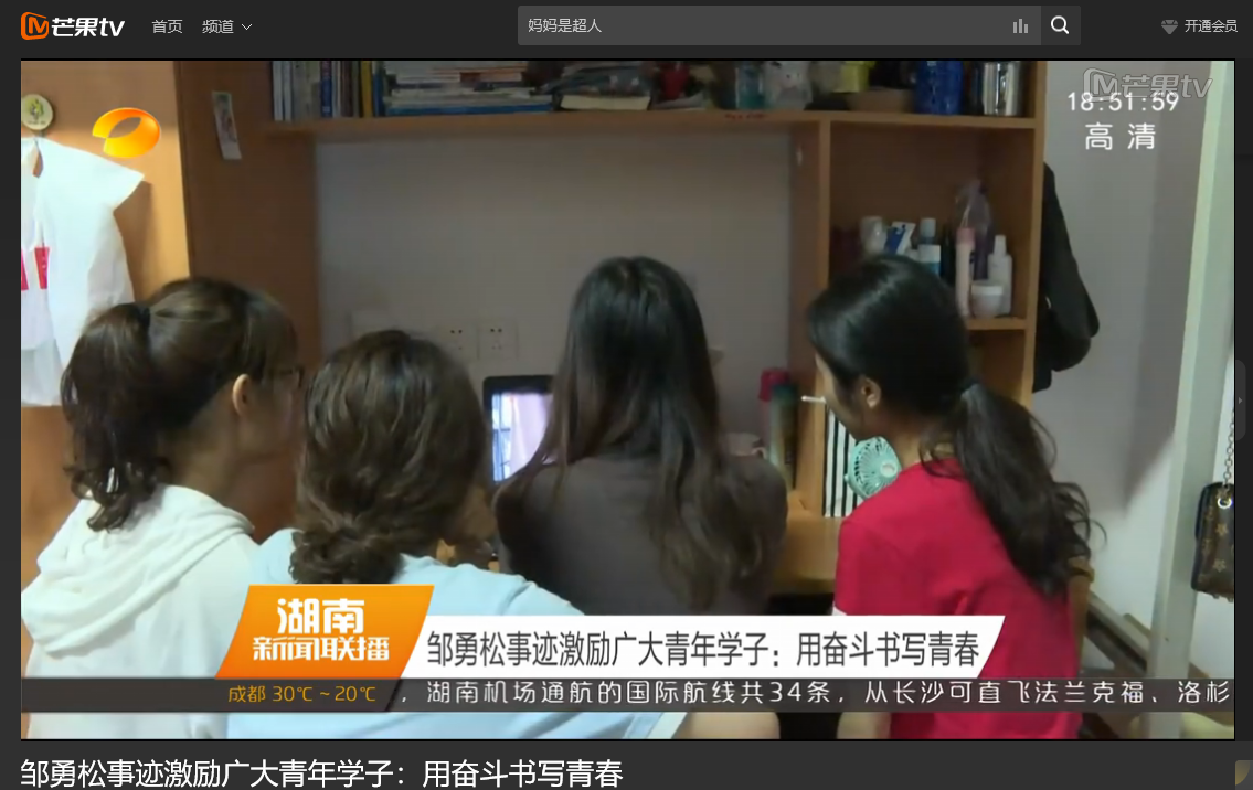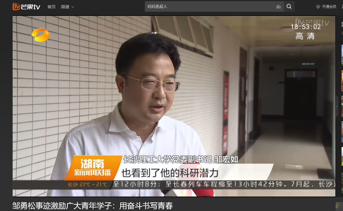 湖南卫视 6月11日新闻联播,以《邹勇松事迹激励广大青年学子:用奋斗书写青春》对我校计算机与通信工程学院15级研究生邹勇松进行了报道。