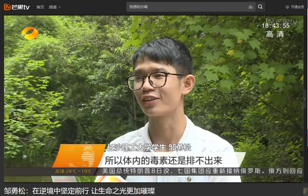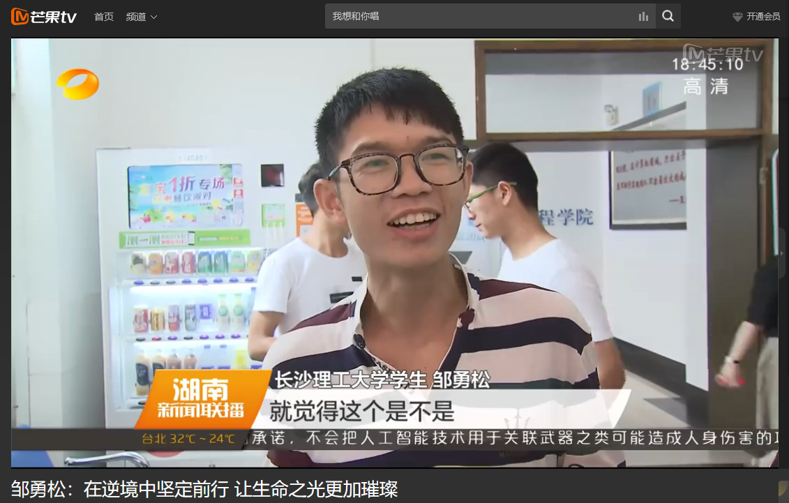 湖南卫视 6月9日新闻联播,以《邹勇松:在逆境中坚定前行 让生命之光更加璀璨》为题对我校计算机与通信工程学院15级研究生邹勇松进行了报道。