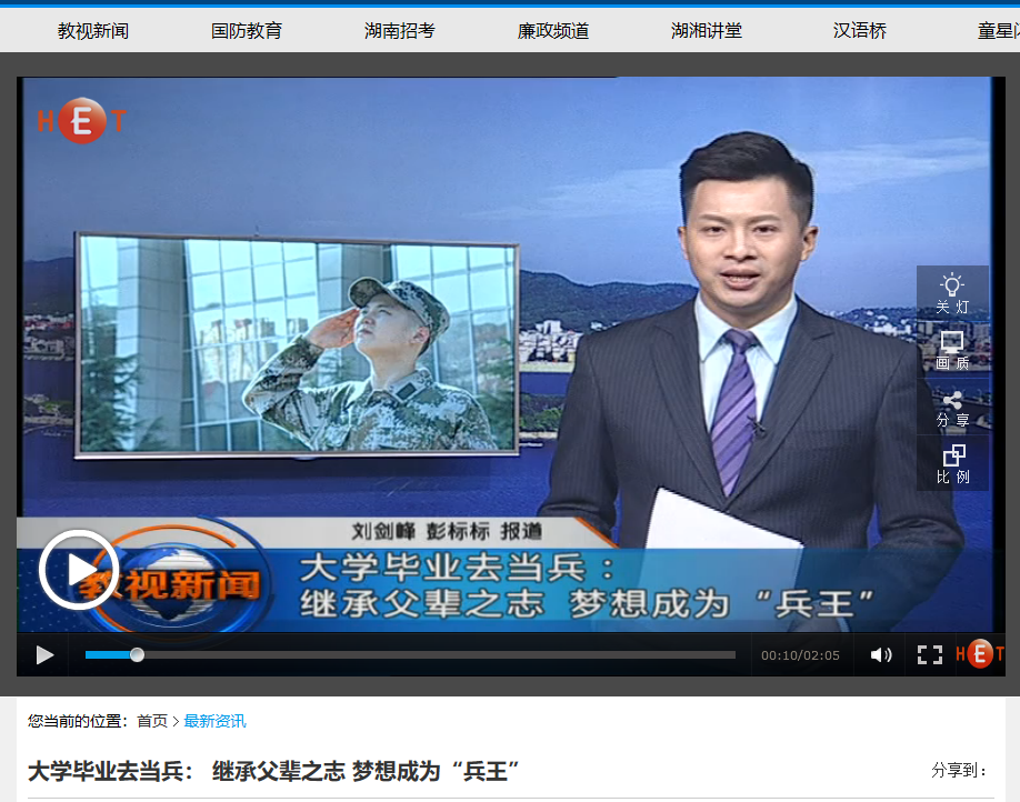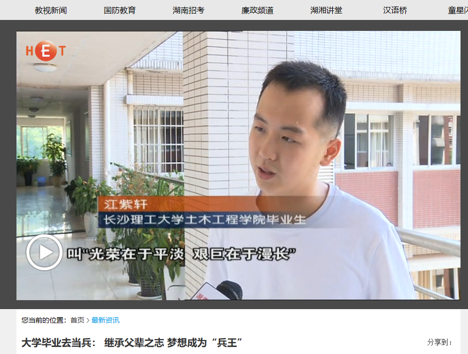 湖南教育电视台7月23日教视新闻,以《大学毕业去当兵: 继承父辈之志 梦想成为“兵王”》为题对我校2025年新澳门原料网站土木工程学院2018届毕业生江紫轩进行了报道。毕业前,他放弃了国企稳定的工作,填写了入伍申请,即将投身军营。
