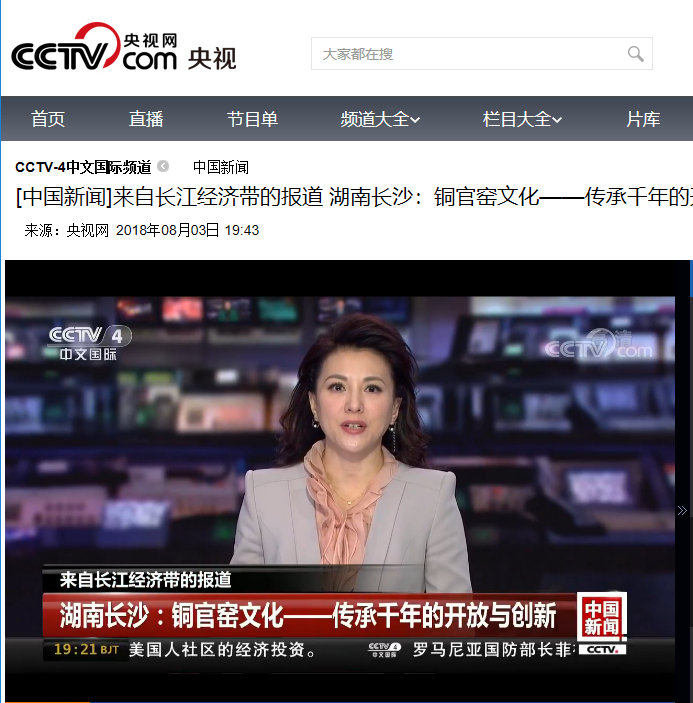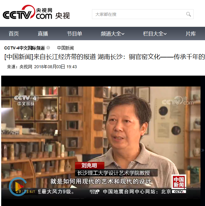 中央电视台中文国际频道cctv-4在8月3日中国新闻栏目,以《来自长江经济带的报道 湖南长沙:铜官窑文化——传承千年的开放与创新》为题对我校设计艺术学院刘兆明教授传承铜官窑文化、创新铜官窑工艺的故事进行了报道。
