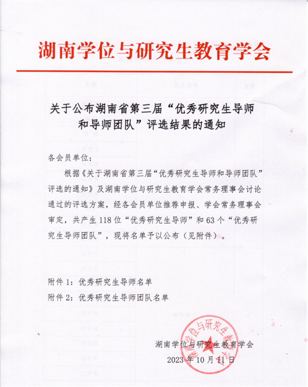 湖南省第三届“优秀研究生导师”和“优秀研究生导师团队”评选结果已公布,共评选118位“优秀研究生导师”和63个“优秀研究生导师团队”。我校6位研究生导师、4个研究生导师团队获表彰,其中,交通学院张军辉、土木学院韩艳、水利学院姚宇、电气学院王媛媛、经管学院黄维、化学学院卿志和等6位研究生导师获评“湖南省优秀研究生导师”,由交通学院郝威负责的“智慧交通协同管控研究及应用创新团队”、土木学院王磊负责的“路网桥梁群运营安全风险防控团队”、汽机学院毛聪负责的“智能装备与智能制造团队”、经管学院王治负责的“业财融合与工程财会团队”获评“湖南省研究生优秀导师团队”。