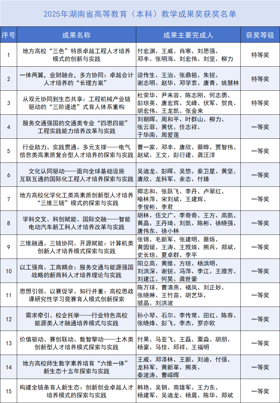 近日,湖南省教育厅正式公布了2025年湖南省高等教育本科教学成果奖获奖名单,我校在本届评选中表现卓越,成果丰硕,共斩获特等奖3项、一等奖12项、二等奖9项,获奖等级和数量实现“双突破”。