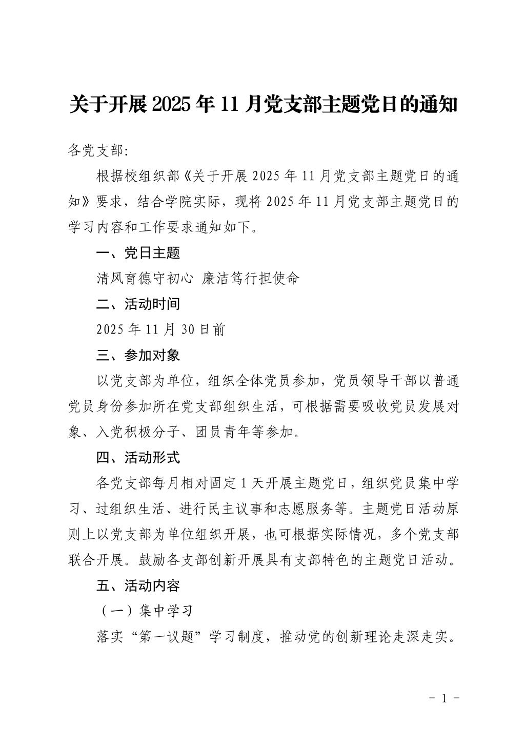 关于开展2025年11月党支部主题党日的通知