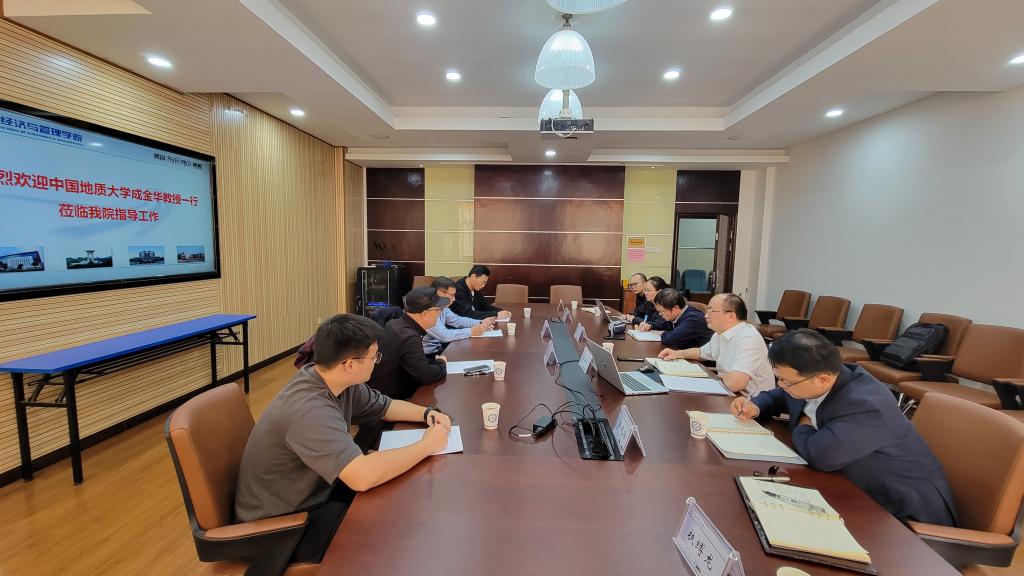 2022年10月19日上午,在学院7教204会议室,中国地质大学(武汉)成金华教授、徐德义教授一行莅临我院指导学科建设工作。学院副院长(主持工作)彭新宇教授主持会议。学院何昊副院长、数字经济系主任胡尊国、经济与贸易系主任陈洁、金融系主任李兆琼、MBA中心主任扶缚龙等教师参加会议。