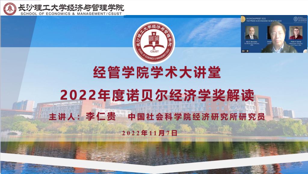 2022年11月7日晚上,中国社会科学院经济研究所李仁贵研究员应邀来我院进行学术交流,做了题为《2022年度诺贝尔经济学奖解读》的专题讲座。讲座采取线上及线下相结合的方式进行,学院部分老师和研究生共计150余人聆听了报告。此次讲座由副院长彭新宇教授主持。