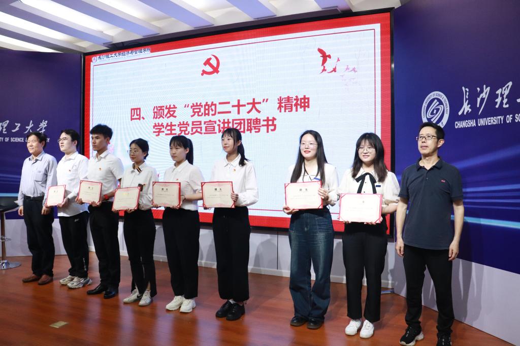 议程第四项,唐青宣读经管学院“青春践行党的二十大”主题教育活动方案。她指出,主题教育活动是学生思想教育与日常管理相融合的重要活动,要在广大学生中播撒下真善美的种子。她鼓励学生党员发挥党员的先锋模范作用,带动全体同学在丰富的主题教育活动中受锻炼、长本领。同步举行了“党的二十大精神学生宣讲团”聘任仪式,校关工委主任王乃厚和学院专职组织员丁力为学生宣讲团成员颁发聘书。