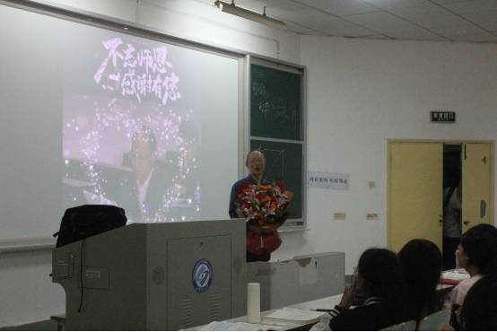 随后,辅导员叶鑫老师走上讲台播放视频,展现王老师各种难忘的经典瞬间。经贸系主任陈洁手捧鲜花向王老师献花,刘明栋老师作为教师代表简短发言,曹冰玉教授代表学院发言,最后大家合影留念。