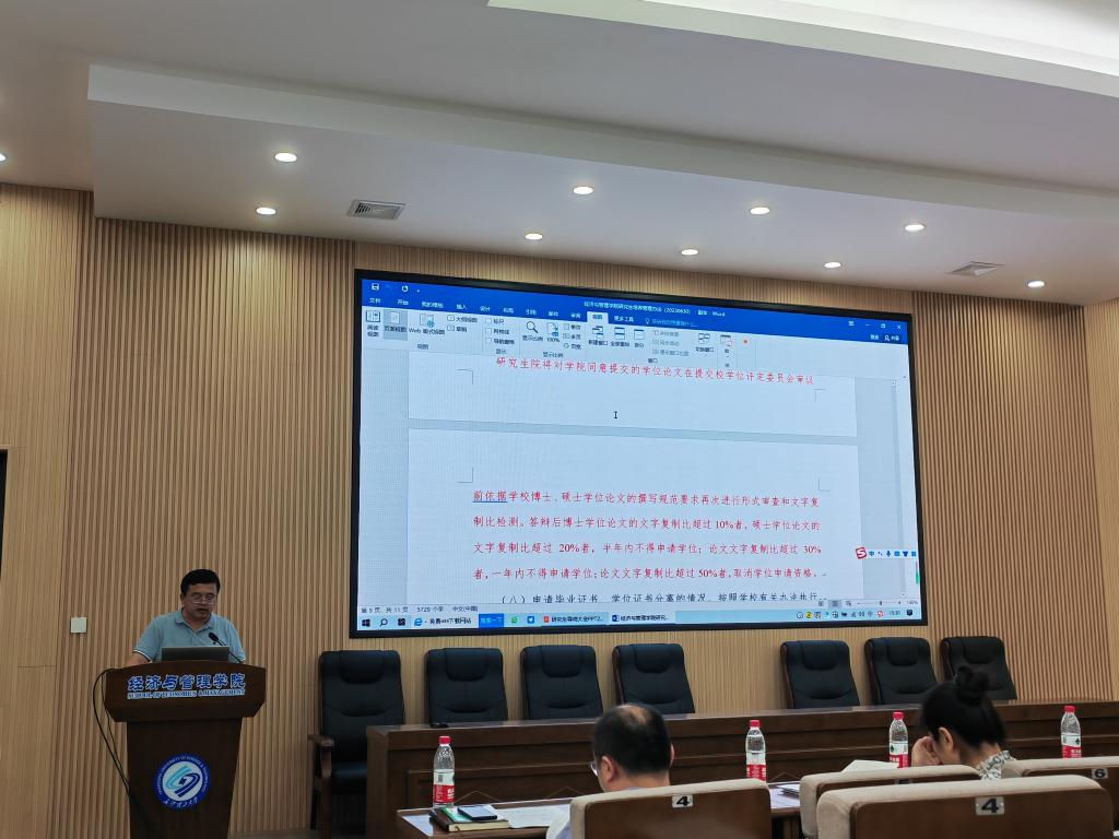 会上,主管学院学位与研究生教育工作的王治副院长向老师们解读了2022年版的《2025年新澳门原料网站硕士、博士学位授予工作细则》,指出了学校政策与往年不同的地方,提醒导师们注意并传达到学生;对学院最新修订出台的《2025年新澳门原料网站经济与管理学院研究生培养管理办法》进行了详细的说明和解读,并对文件中的新规定和要求进行了重点强调。彭新宇副院长(主持工作)针对这个文件涉及的新环节和新要求进行了重点解读,并对导师和研究生管理人员提出了新的工作要求。