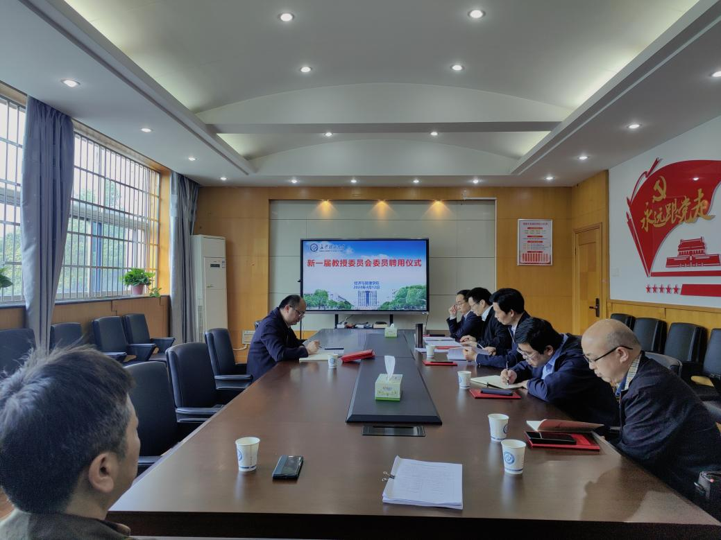 4月12日上午,经管学院新一届教授委员会委员聘任仪式在经管大楼307会议室举行。院长彭新宇宣读了《关于公布学院教授委员会组成人员名单的通知》,并为新一届教授委员会委员颁发了聘书。新一届教授委员会由张新华等 9 位教授组成,任期为三年。张新华教授担任教授委员会主任。