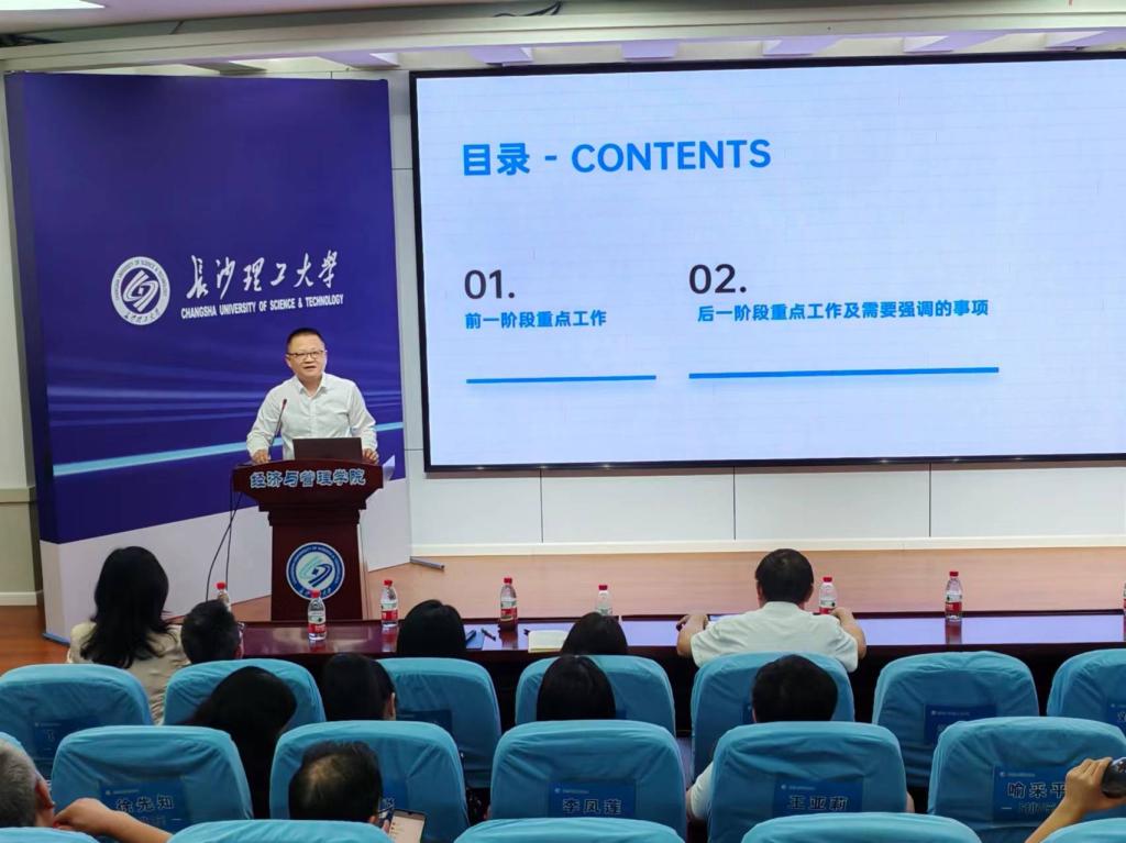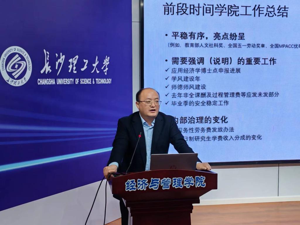 院长彭新宇通报了前段时间科技工作开展情况,对前段时间各项工作进行总结,讲解学校内部治理的变化,并对应用经济学博士点申报进展、学风建设年、师德师风建设等五项需要强调的重点工作作了说明。接着,彭新宇作了题为《讲“普通话”还是“家乡话”:关于差异化竞争优势的思考》的报告,从问题提出、我们的比较优势及必须坚持的方向等三个方面剖析了数智时代传统商科教育遭受的挑战,分析了学院现有比较优势,强调在讲好“普通话”的基础上讲好“家乡话”,传承、强化行业办学特色,主动对接学校交通、电力等优势学科,确立“行业特色+数智改造”的专业建设思路,开发行业、数智商科课程,选派教师到行业企业定岗锻炼,开展面向行业特色领域的研究,培养行业所需经管复合型人才。