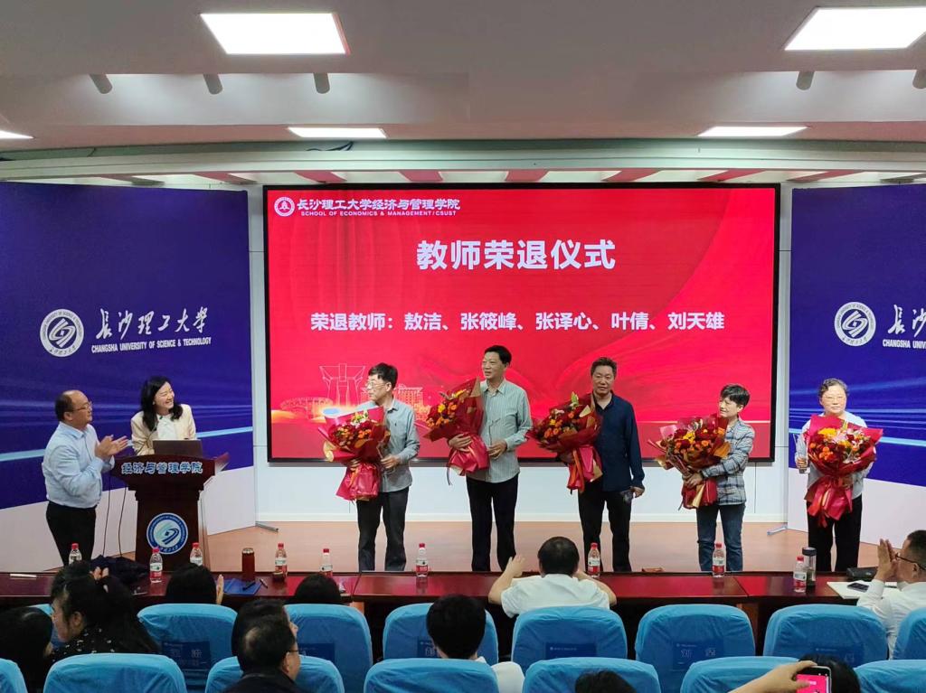 第三个议程举行了教师荣退仪式。青年教师代表向今年以来退休的敖洁、张筱峰、张译心、叶倩、刘天雄等五位荣退教师献花。荣退教师代表张译心、刘天雄依次发表了退休感言。张译心回顾了自己四十二年的教学生涯,感念学校、学院、同事之间的情谊,表达了对学院的依依不舍和深切的祝福。回首过往岁月,面对同事们的不舍,刘天雄有感而发,朗读了自己原创的诗句,字字句句流露出对往昔美好时光的留恋,饱含着对经管大家庭的不舍。彭新宇为退休教师颁发荣退纪念碑和纪念品,与会教职工以热烈的掌声向五位老师致以崇高的敬意和美好的祝福。