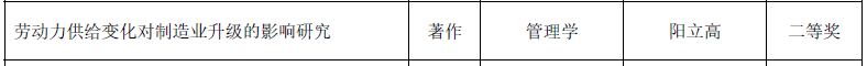 近日,教育部公布了第九届高等学校科学研究优秀成果奖(人文社会科学)评选结果,我院阳立高教授的著作《劳动力供给变化对制造业升级的影响研究》荣获二等奖,叶泽教授的著作《我国电价体系建设与电力发展战略转型研究》荣获三等奖。