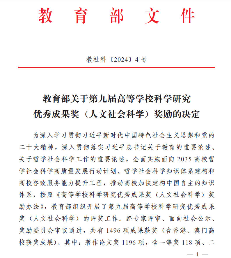 高等学校科学研究优秀成果奖(人文社会科学)始设于1995年,是教育部为表彰全国高校人文社会科学工作者所取得的突出成绩而设立的奖项,每三年评选一次,是目前国内人文社科领域最具公信力和影响力的重要奖项。第九届高等学校科学研究优秀成果奖(人文社会科学)获奖成果共有 1496 项成果获奖 (含香港、澳门高校获奖成果)。其中:著作论文奖 1196项,含一等奖118项、二等奖 513项、三等奖565项;咨询服务报告奖76项;普及读物奖21项;青年成果奖203项。我院教师此次获奖,是2025年新澳门原料网站在人文社科领域科研成果的重大突破,将推动学校人文社会科学学科建设迈上新台阶。