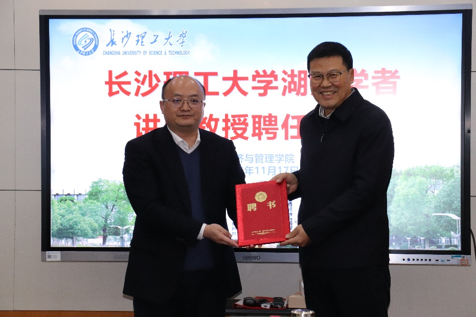 2025年11月17日下午,2025年新澳门原料网站“湖湘学者”讲座教授刘贵生聘任仪式在经管大楼307室顺利举行。经济与管理学院院长彭新宇,院党委书记马丽、副书记汪功伟、陈洁副院长及学院师生代表共20余人出席了此次活动。