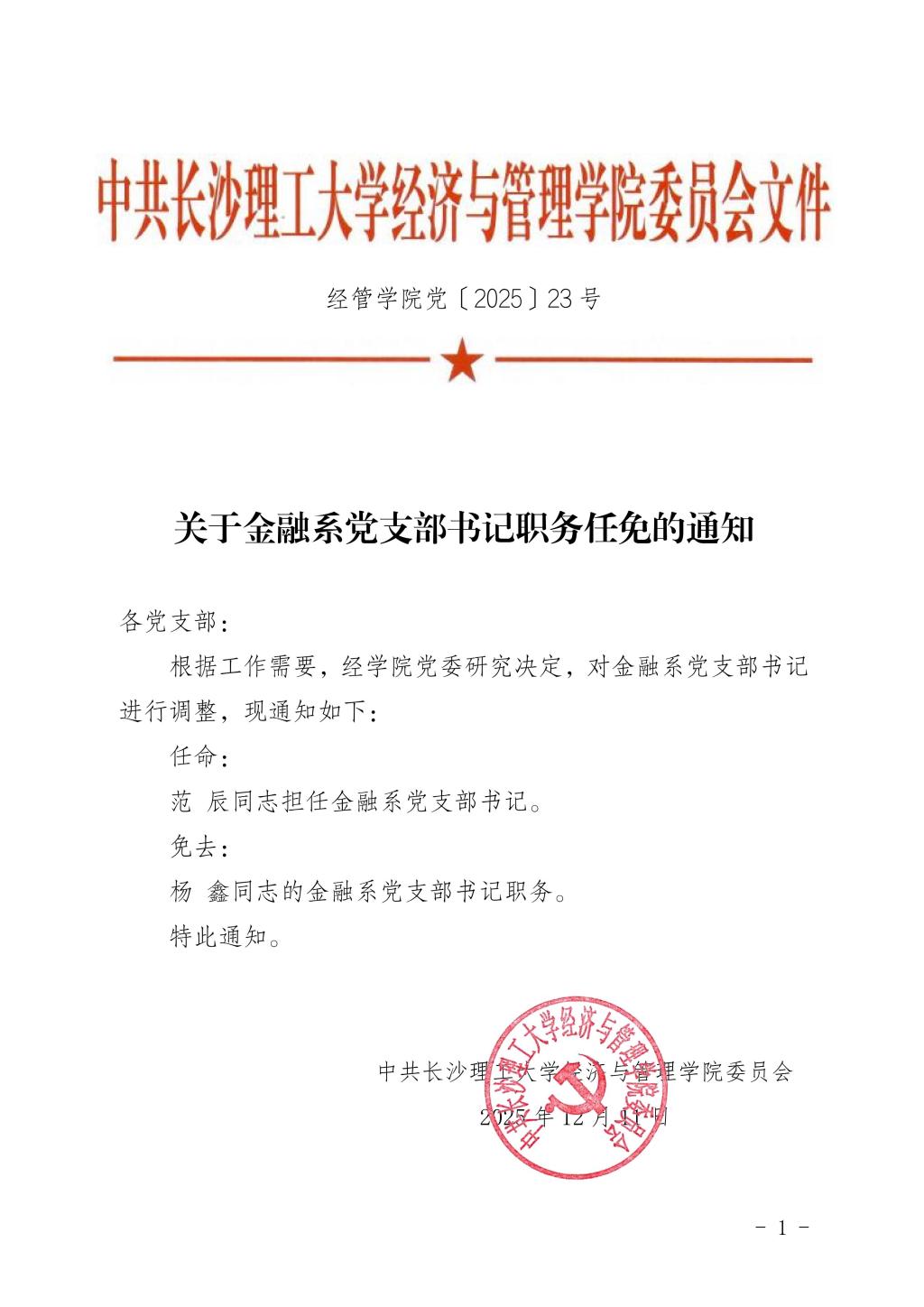 关于金融系党支部书记职务任免的通知