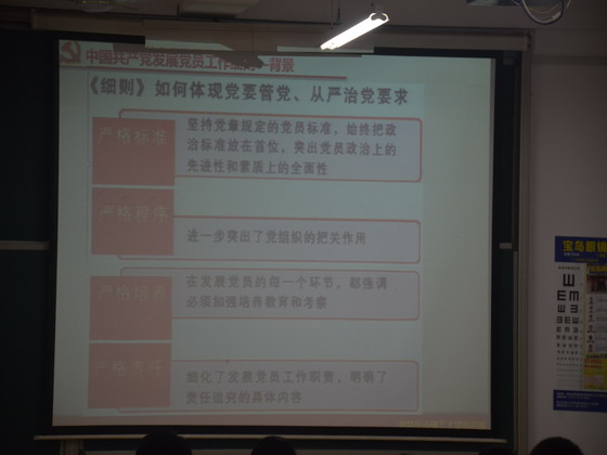 边书记向全体党员讲授了新《细则》颁布的背景和意义,结合我校学生党员发展工作取得的成绩和存在的问题,对党员发展工作中关键环节和重点事项做了详细的讲解。自2014年6月新《细则》颁布以来,我校学生发展党员工作取得了明显成绩,对于规范发展党员工作,提高保证发展党员质量发挥了重要作用。目前,学校学生党建进入体质增效的阶段,要从严格标准、严格程序、严格培养、严格要求四方面来体现党要管党、从严治党的要求,要用“一个标准,一把尺子”整体推进学校学生党员发展工作的目标。同时,他还结合学校2016年学生党员发展的工作要点以及要把我注意的关键和重点,详细党员们进行了剖析和解答。