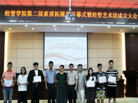 5月16日下午15:00,经济与管理学院第二届素质拓展节开幕式暨经管艺术团成立大会在文科楼A200举行。学院党委书记庄创奇、院长陈银娥,校团委书记王学成,院党委副书记艾楚君、副院长谢朝华出席,会议由院分团委书记陈钰汀主持。