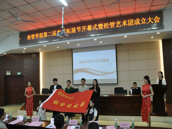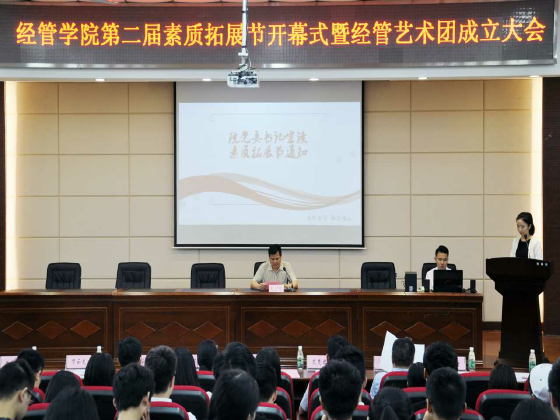 大会在青春飞扬的啦啦操表演后拉开帷幕,院党委书记庄创奇宣布经管学院第二届素质拓展节开幕,并宣读相关通知安排。庄书记指出,举行素质拓展节是营造创新创业氛围、提升同学们专业实践动手能力的途径和平台;本届素质拓展节共分为科技创新、文化艺术、志愿服务、社团风采4个板块,共有活动26项,历时将近一年。学生代表尹湘发言,她畅谈了自己参加社会实践和科技活动的体会和收获,同时号召同学们积极参与素质拓展节的各项活动。经管艺术团团长王鹏程宣读了艺术团章程,并由庄书记、陈院长为经管艺术团授旗。随后,校团委书记王学成讲话,他代表校团委对素质拓展节的开幕及艺术团的成立表示祝贺;充分肯定了经管学院分团委在开展第二课堂活动、社会实践活动等方面取得的成绩;并就学院分团委如何围绕中心工作,履行服务职能,开展好活动吸引青年、凝聚青年提出了希望。陈银娥院长做了热情洋溢的讲话,她指出:学院一直重视学生科技活动,积累了良好的基础,取得了一系列的成绩,素质拓展节就是对学院各项课外科技活动的优化设计和整合;也是学院构建全员全过程全方位育人的体现;素质拓展节和经管艺术团的活动彰显了经管学子求真务实、锐意进取的青春风貌,展示了青春学子的激情活力、独特魅力;并向广大同学和团组织提出要求,希望同学们热心参与、希望分团委精心组织、希望团员青年信心向前。最后,出席会议的领导为经管艺术团颁发聘书并合影留念。
