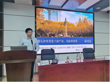 2023年11月4日下午15:00,同济大学经济与管理学院党委副书记阮青松教授应邀为我院师生开讲金岭学术大讲堂第九期,主题为“俄乌冲突背景下的产业、风险和投资”,讲座在金盆岭校区7教212举行。讲座由经管学院副院长刘坚主持,经管学院院长彭新宇、研究生院副院长尹筑嘉到场交流,200多名师生现场聆听了讲座。