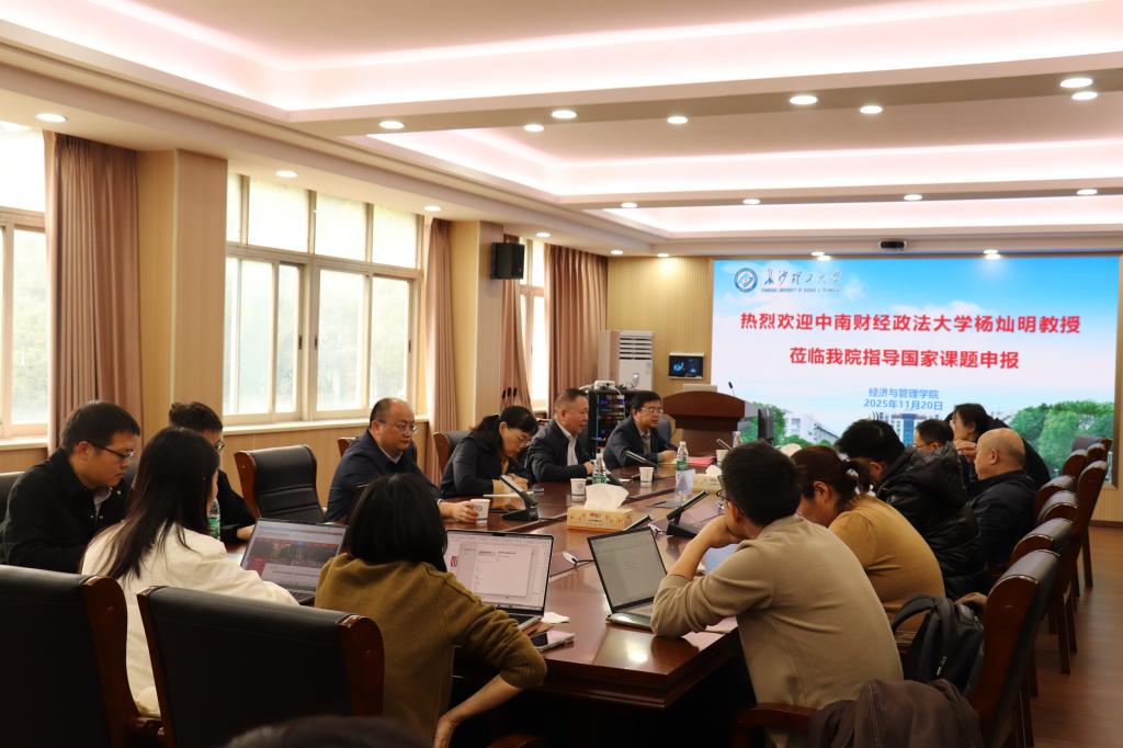 2025年11月20日下午,在经管大楼202会议室举行“2026年国家基金项目申报指导”系列专题讲座。中南财经政法大学杨灿明教授应邀主讲,讲座由王治副院长主持,彭新宇院长出席,30余名教师参加了本次讲座。
