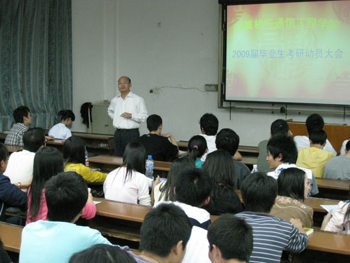 会上,霍向阳副书记首先向与会学生介绍了学院研究生教育发展情况、在国内研究生教育中所处的位置,报考中应注意的若干问题,并就学院往年的考研情况、09届毕业生的报考准备情况进行了说明,并重点对今年的考研形势进行了分析。计算机与通信工程学院现有计算机应用技术、计算机软件与理论、通信与信息系统三个二级学科硕士学位授予点,目前,正在积极为申报一级学科硕士点和二级学科博士点。届时我院计算机学科将拥有从本科、硕士到博士的完整培养体系。他鼓励同学们根据自己的实际情况,理性选择学校。