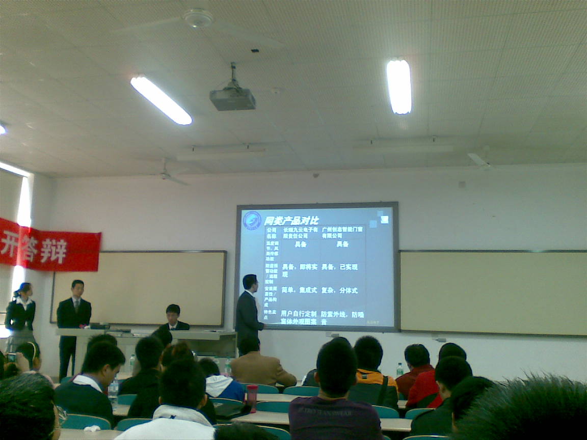 我院“智能窗户控制系统”研发团队在在B-201与来自电气学院的“VIC-2.0 型电气多功能参数测试仪”、化生学院的“绿色环保型循环冷却水阻垢缓蚀剂研发”等的竞争,“新一代基于Linux的嵌入式虹膜系统”研发小组在A-202与来自物电学院“稻杆复合材料烟花筒”研发团队、经管学院的“绿润风尚草鞋”等项目同台竞争,经过模拟辩论调整后计通学院的创业队伍在答辩中表现优秀,虽然仍有不足之处但还是赢得了在场评委的普遍好评。