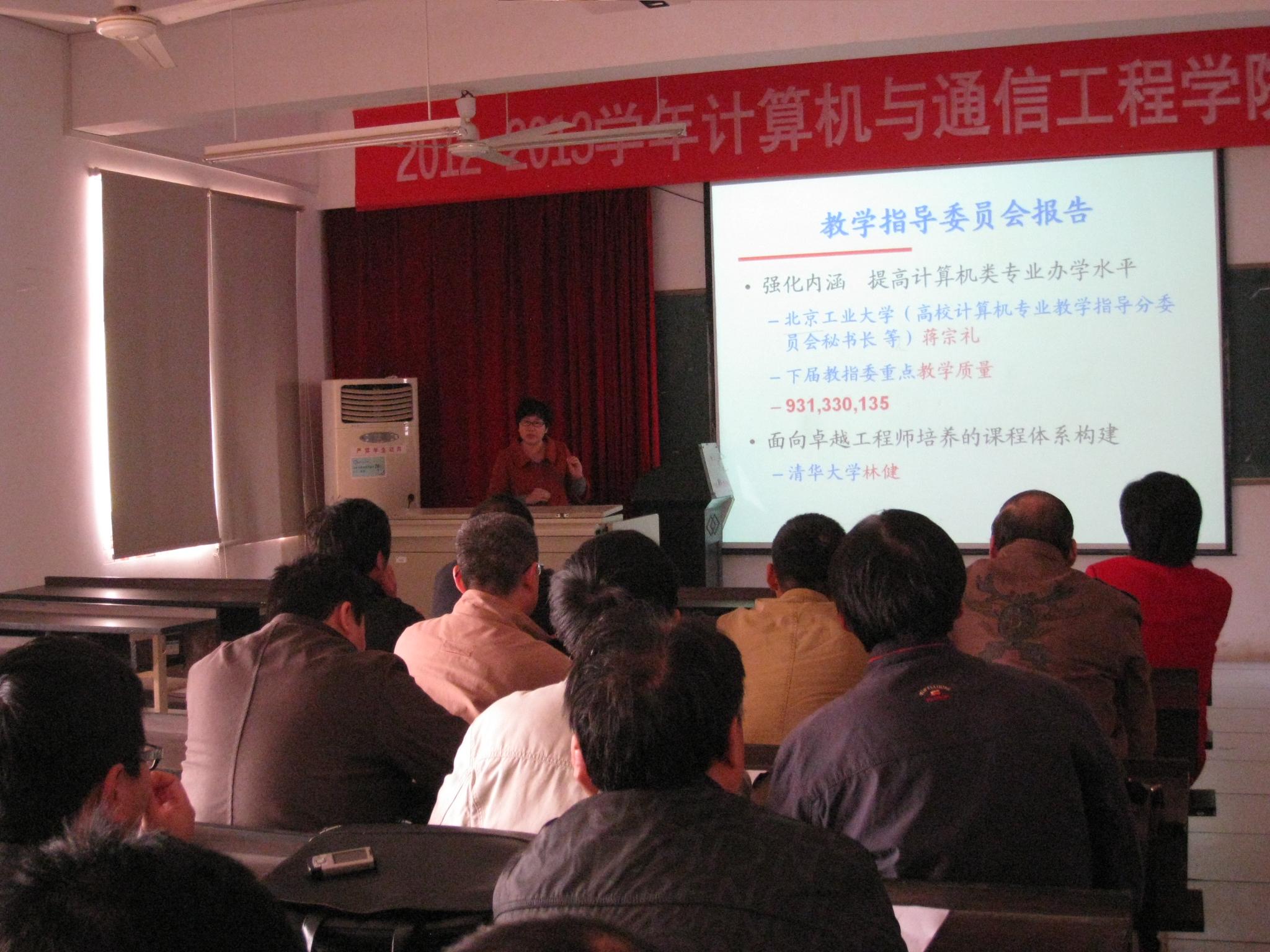 1113下午,计算机与通信工程学院在理科楼B311召开主题为“找准定位,明确目标,突破关键,特色发展”的专业建设经验交流会。会议首先由网络工程系系主任姜腊林老师介绍中国计算机学会在温州大学举办的“第五届全国高校计算机网络教学研讨会”的重要内容,并重点介绍温州大学网络工程专业(国家级卓越工程师培养专业)的建设经验。然后,各系教学骨干针对如何找准专业发展定位,提炼专业特色开展了讨论。最后,龙敏副院长对会议进行了总结,认为温州大学的“校企深度联动”特色值得我们学习和借鉴,要求各专业负责人和骨干教师要多调研、勤思考,打造专业特色,树立专业品牌,为提高教育教学质量打下坚实基础。