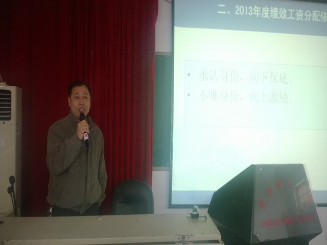 会上,龙敏副院长、李平副院长、徐蔚鸿副院长分别就专业认证、2014年科研工作的开局与应对、研究生工作做简短阐述,随后李峰院长就2013年度绩效工资分配做详细解读,从学院各单位2013年进院经费完成情况、2013年度绩效工资分配依据、2013年总收入、2013年度越级奖励情况分析,确保收入分配透明公开,同时希望老师们对学院要充满感情,培养学生要投入热情,为学院发展要释放激情,努力营造一个积极向上的氛围,为着我们共同的目标、荣誉而努力。