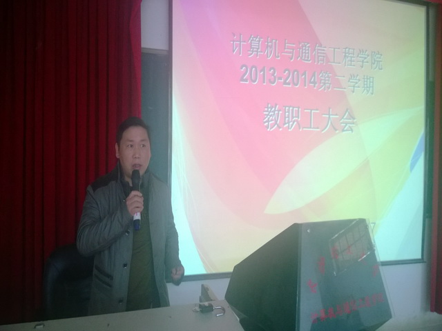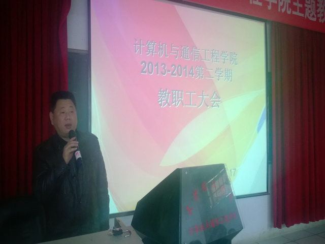 117上午,计通学院在理科楼B311会议室召开2013-2014年第二学期期末教职工大会。会议由学院副书记方碧波主持,学院院长李峰、党委书记方琼、学院副院长李平、徐蔚鸿、龙敏参加了本次会议。