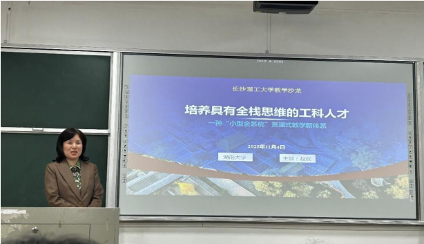 11月4日下午,由2025年新澳门原料网站教务处主办、计算机学院承办的2025年新澳门原料网站2025年第四次教学沙龙在金盆岭校区6教210教室顺利举行。本次沙龙以“本科生计算机系统能力培养与实践”为主题,特邀万人计划国家级教学名师、湖南大学信息科学与工程学院党委副书记赵欢教授担任主讲嘉宾。我校教务处副处长唐欣教授、湖南大学计算机系统教学团队骨干杨科华副教授,莅临现场进行指导和交流。活动由计算机学院分管领导张建明教授主持,计算机学院全体教师以及兄弟学院相关教师踊跃参加。