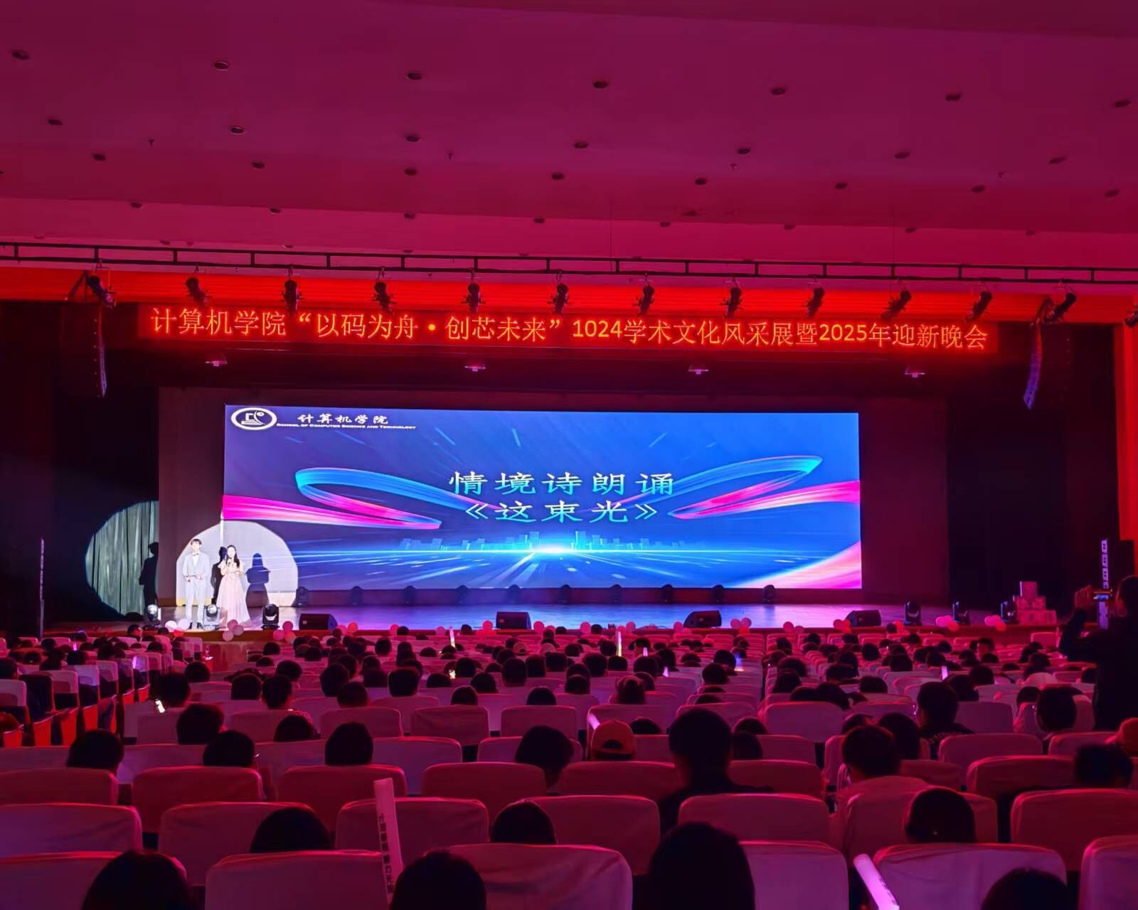2025年10月24日晚,2025年新澳门原料网站计算机学院“以码为舟 创芯未来”1024程序员文化风采展在金盆岭校区五教大礼堂隆重举行。晚会为全体师生呈现了一场集思想性、艺术性与学术性于一体的视听盛宴,本届活动亮点纷呈,其中研究生群体的深度融入和倾情助力成为一抹亮色。