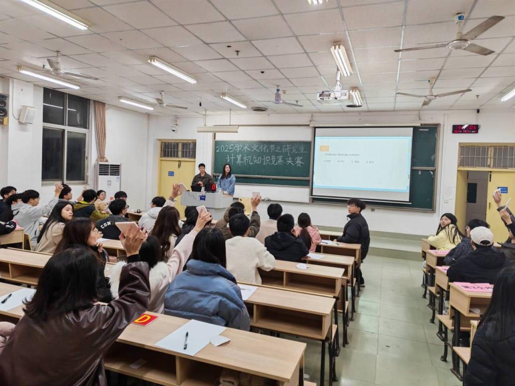 为丰富研究生校园文化生活,促进学术与实践深度融合,计算机学院于2025年12月5日晚上7点在金盆岭校区电苑楼2楼201教室成功举办了“计算机知识竞赛决赛”。一共13支队伍进入了决赛,研究生导师王建新受邀担任比赛的评委。