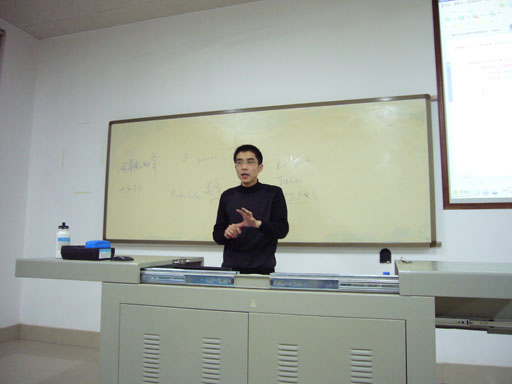 之后,由蓝杰实训公司技术总监、Java技术经理胡东峰老师向大家介绍了“Robocode机器人编程设计大赛”的相关知识。在一个半小时的讲座中,