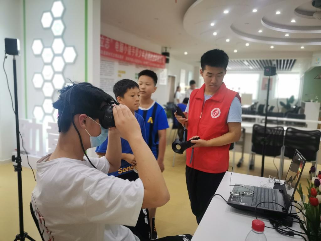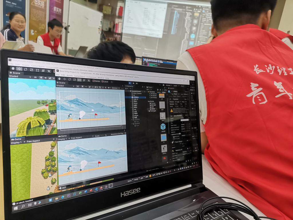 志愿者们先后开设了《认识不一样的计算机》《少儿编程》《从电游到电竞》《游戏氪金背后的秘密》《守护网络安全》等专题课程。来自雅礼天心、明德天心、天心实验等多所中小学的20余名学生分批参加了课程研学。在课上,志愿者们教会了一批青少年如何正确管理电脑存盘、如何防止电脑密码被盗取、如何反诈,并采用分组教学形式,自带电脑1对2进行实操教学,让中小学生掌握了简单的scratch少儿编程、unity软件编程制作游戏动画方法等,内容覆盖理论和实践,教给了同学们大量实用的知识技能。同时,还让同学们体验了VR设备,讲解了高新科技。志愿者们有意识地在课堂中进行德育渗透,将庆祝建党百年主题的素材嵌入教学内容中,如制作动画游戏采用的主题是“长征”,选用的游戏界面制作素材是“红军”“草地”“红旗”等,在传授科技知识的同时,进行了红色文化教育。