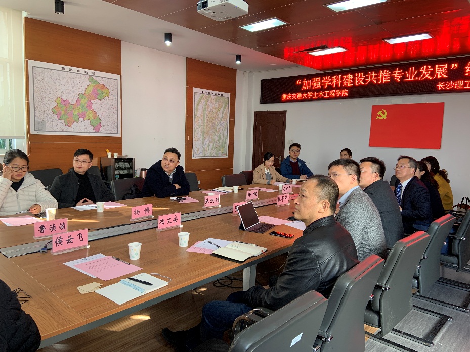 上午,调研小组在重庆交通大学土木工程学院,与该院领导及道路系部分骨干教师座谈交流。朱洪洲副院长详细介绍了重庆交通大学土木工程学院的历史沿革、平台支撑、科研和学科建设等情况。张锐副院长也介绍了我院交通运输工程学科建设基本情况。随后,双方围绕科研成果转化、学科建设、科研团队搭建及人事考核制度改革等方面进行了热烈研讨。