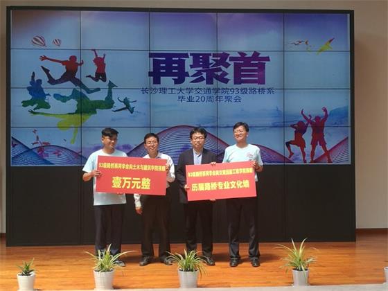 会上,全体93级路桥专业同学还向交通学院捐建“历届路桥专业校友文化墙”,向土建学院捐赠一万元;魏建国和黄智军两位校友向教育基金会捐赠5000元用于在金盆岭校区认养一棵校友树。此次同学聚会突破了湖南省单次同学聚会155人的记录,全年级226位同学,实际到达164位同学,18位老师、5位学友嘉宾、20余位家属参与部分活动,达到200人。校友们在校园内参观合影留恋,还在学校食堂体验了一回“学生餐”,重拾青春味道,并在阶梯教室分班举行了主题班会。
