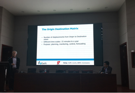 Henk van zuylen曾担任中荷智能交通培训中心主任(北京)和荷兰TRAIL研究院院长,致力于交通运输及相关领域的研究30余载,拥有丰富的交通研究经验。在讲座中,Henk van zuylen教授首先为大家讲解了传统的交通规划四阶段法中反推OD矩阵的缺点和局限性,并提出了在大数据时代下,利用自动识别车辆牌照、探测车和蓝牙等多源数据推算OD矩阵的优势,重点讲解了信息最小化法、最小二乘法、贝叶斯法。Henk van zuylen教授的讲解不仅给我院师生带来了国际前沿的学术知识,而且拓宽了大家的学术研究思路。
