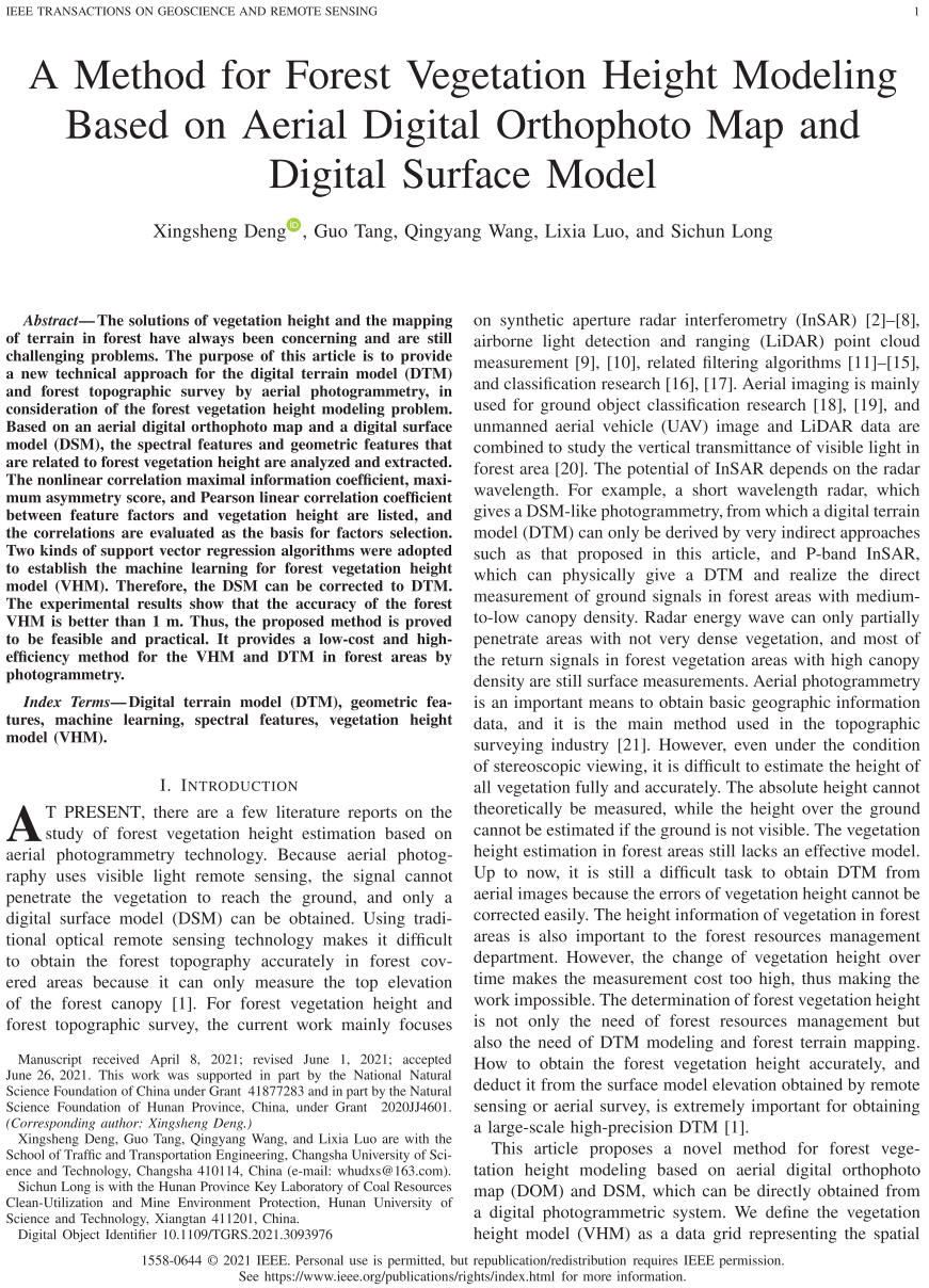 近日,交通学院测绘工程系邓兴升团队研究成果“A Method for Forest Vegetation Height Modeling Based on Aerial Digital Orthophoto Map and Digital Surface Model”,利用林区植被高度与可观测量之间的相关性,提出基于航空数字正射影像与数字表面模型建立植被高度模型的机器学习方法,使得林区植被高度这一不可由航空摄影直接观测的物理量有了新的确定方法,该论文发表于国际顶级遥感学术期刊IEEE Transactions on Geoscience and Remote Sensing (IEEE TGRS)。邓兴升为该论文第一作者,2025年新澳门原料网站为第一署名单位。
