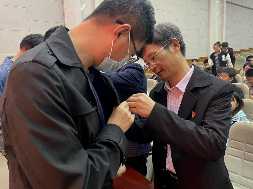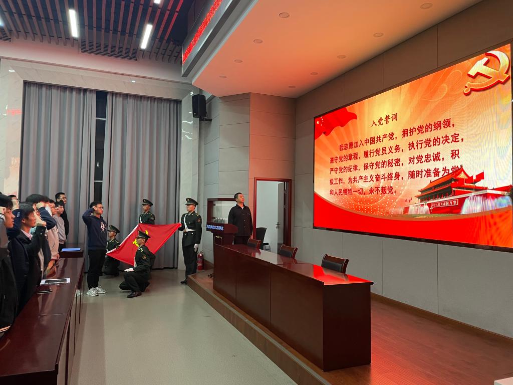 在授徽仪式中,全场起立迎党旗,奏唱“国际歌”,正式党员代表为全体预备党员授予党徽,全体党员面向党旗进行入党宣誓。