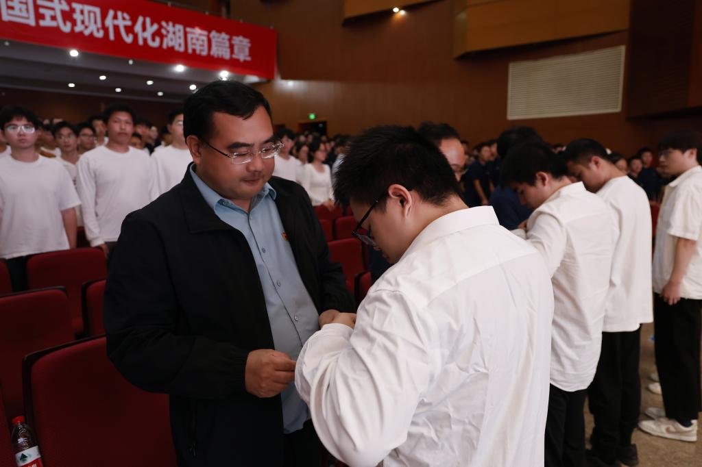授徽仪式在庄重的《国际歌》合唱中拉开序幕。合唱结束后,授徽仪式正式开始。与会领导、老师和各支部支委依次为新入党同志授予党徽。随后,由本科生道路专业守正党支部的唐君虎同志带领全体预备党员面向党旗进行庄严的宣誓。