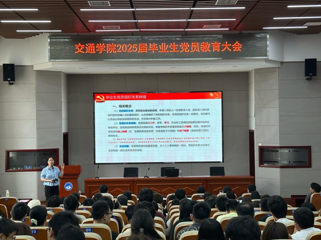 5月27日,交通学院2025届毕业生党员教育大会在工二交通科技报告厅举行,学院党委书记成华、研究生辅导员李文博及2025届全体毕业生党员参加,学生党总支副书记肖敏强主持会议。